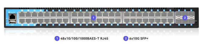 ① 48x 10/100/1000BASE-T ports, PoE/PoE+ ② 6x 10GE SFP BASE-X