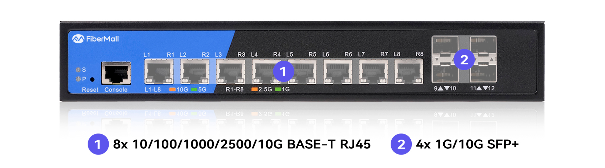 ① 8x 10/100/1000/2500/10G BASE-T ② 4x 1G/10G SFP+