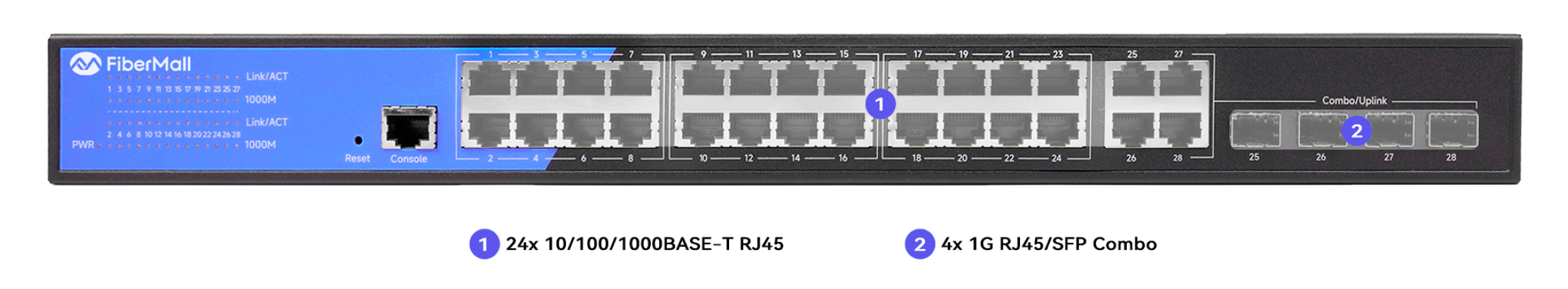 ① 24x 10/100/1000BASE-T RJ45 ② 4x 1G RJ45/SFP Combo