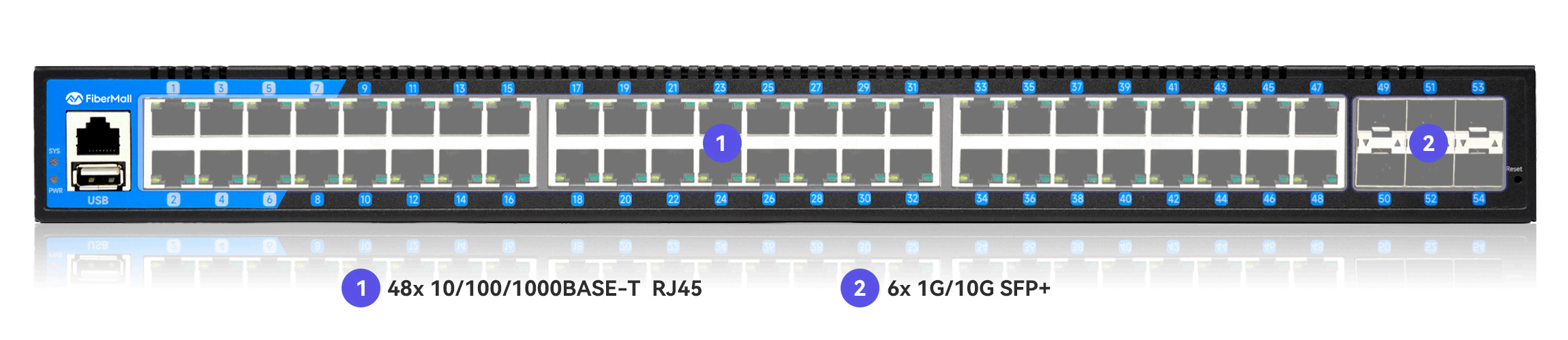 ① 48x 10/100/1000BASE-T RJ45 ② 6x 1G/10G SFP+