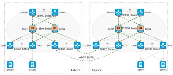 The typical data center application is an EVPN-VxLAN design, S12500G-AF or S12500X-AF switches work as spine or spine/border, S68XX series work as leaf and border or ED. From this design, the users can get a non-blocking large L2 system.