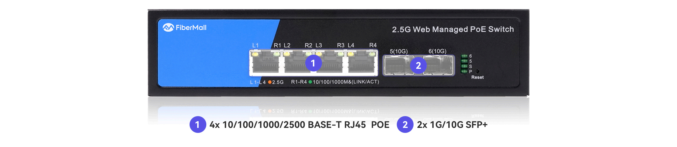 ① 4x 10/100/1000/2500 BASE-T RJ45 POE ② 2x 1G/10G SFP+